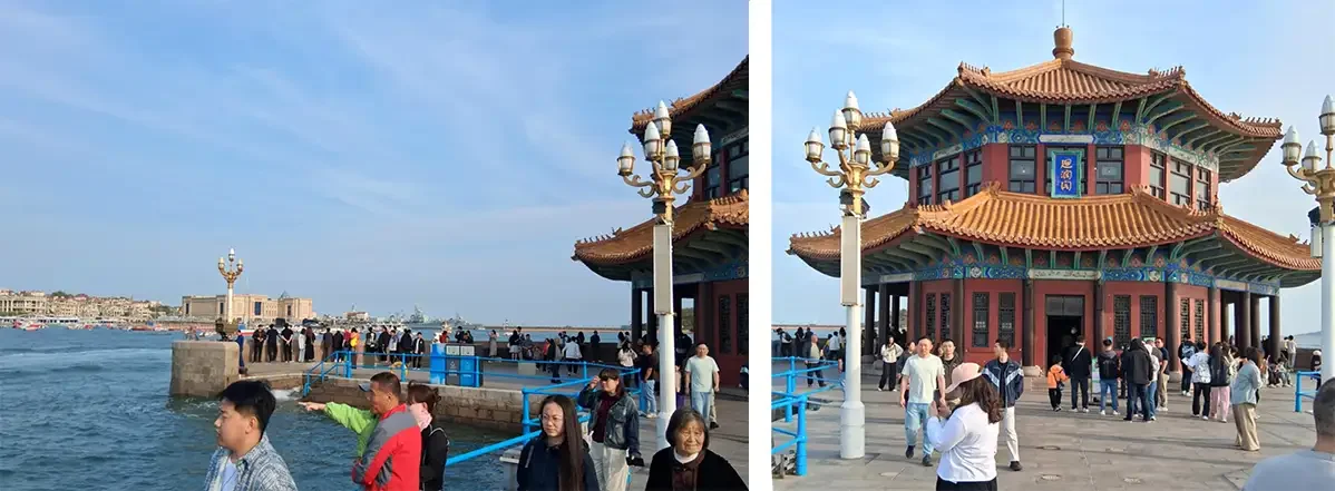 We spent a couple of hours wandering old Qingdao’s heart, soaking in its charm, history, and coastal beauty. Our walk began along Xinhaoshan Road, a scenic coastal route offering sweeping views of the sea, century-old villas, and leafy promenades. Next, this path led to Zhanqiao Pier, one of Qingdao’s most iconic landmarks. First built in 1891 and extended under German rule, the pier remains a favourite for locals and tourists alike. At its tip stands the red-roofed Huilan Pavilion, offering panoramic views of the bay and skyline — and adorning every bottle of Qingdao’s world-famous Tsingtao beer.