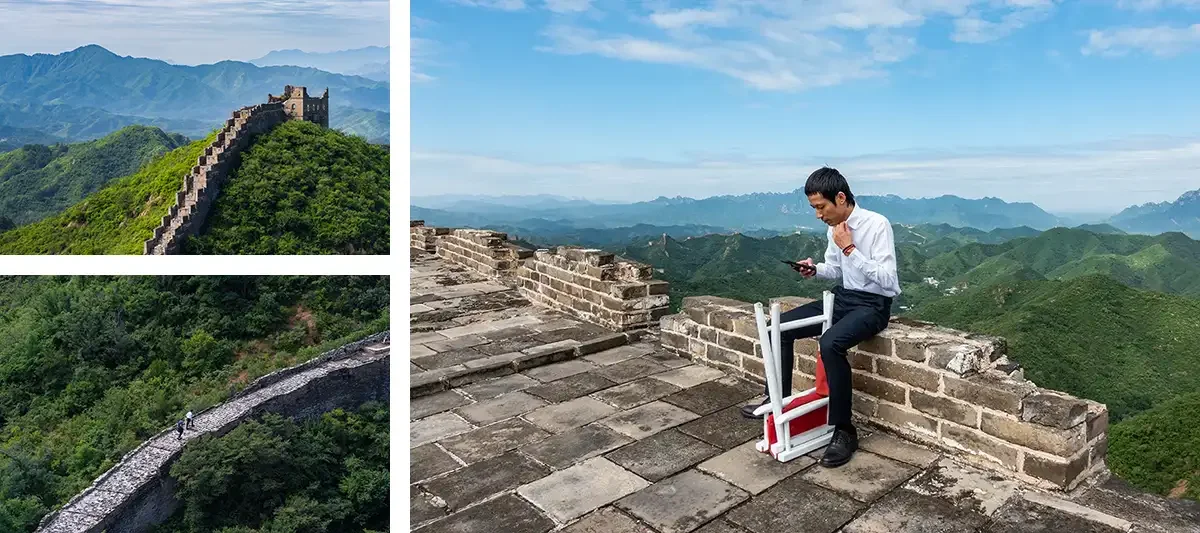 We place our chair halfway along a particularly enticing curve, it’s place at the ‘Take Your Seat’ Beijing exhibit set in stone. Afterwards, both wall and chair beckon our camera to join them. We mount our camera on our tripod and extend it fully into the sky precariously above our heads to take full advantage of the angle and height. With palpable excitement, we fire off a rapid series of shots. It feels as if the dragon might fly away at any moment. There, surrounded by the past and enveloped by nature, we are greeted by the unlikely pairing of Wall and chair. Impossibly, we soar higher than even our place on the Wall.