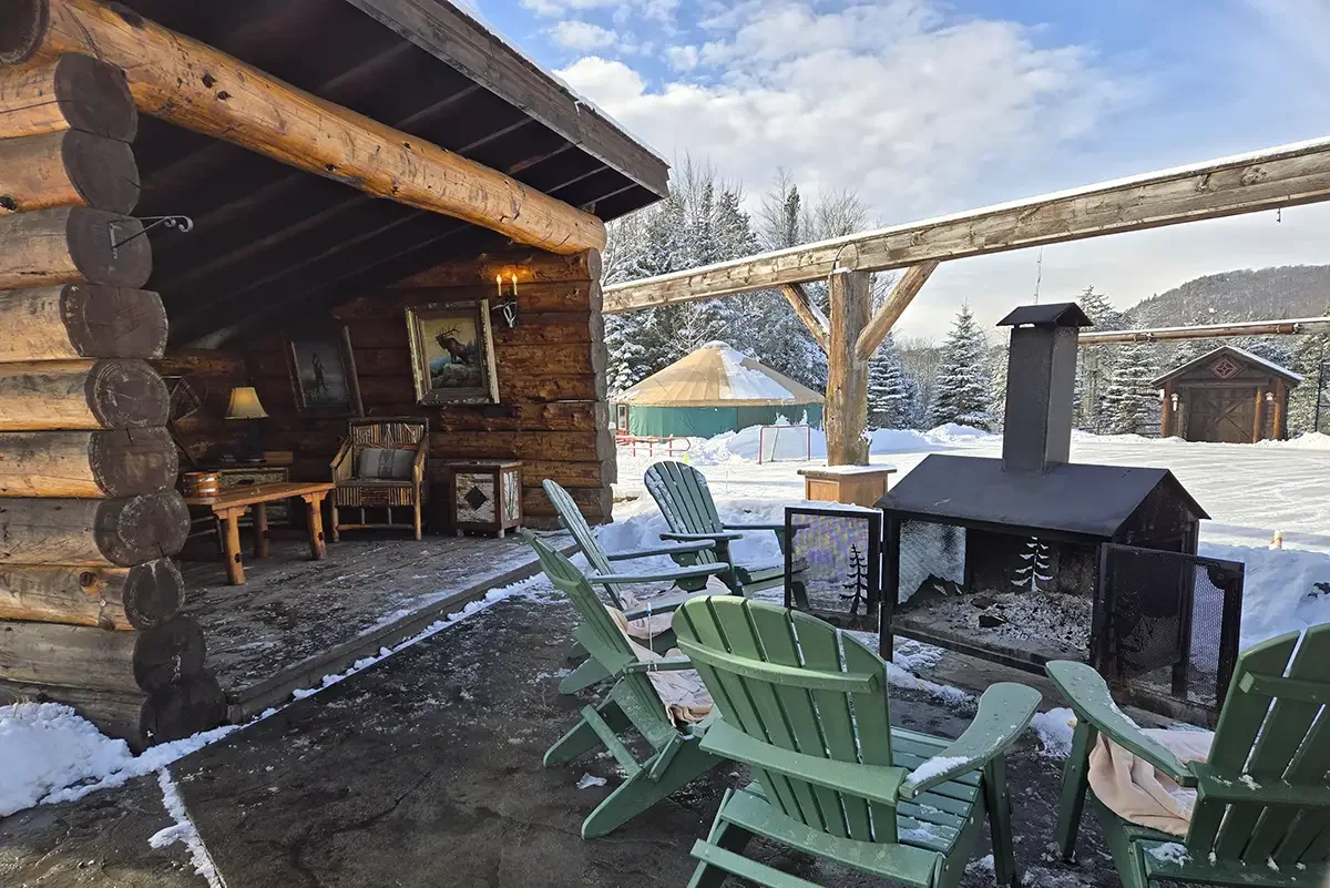 One of the most memorable features of the property is the outdoor ice rink. It’s large, beautifully maintained, and lit at night so guests can skate under soft white lights. Whether you’re gliding casually or joining a lively game of hockey, the setting feels almost cinematic. Beside the rink are two outdoor cabanas furnished with comfortable seating, all gathered around a single large fireplace—a cozy hub for warming up, sipping something hot, or simply watching the skaters glide by. A separate cigar nook with deep chairs sits nearby, offering its own rustic charm even without a fire.